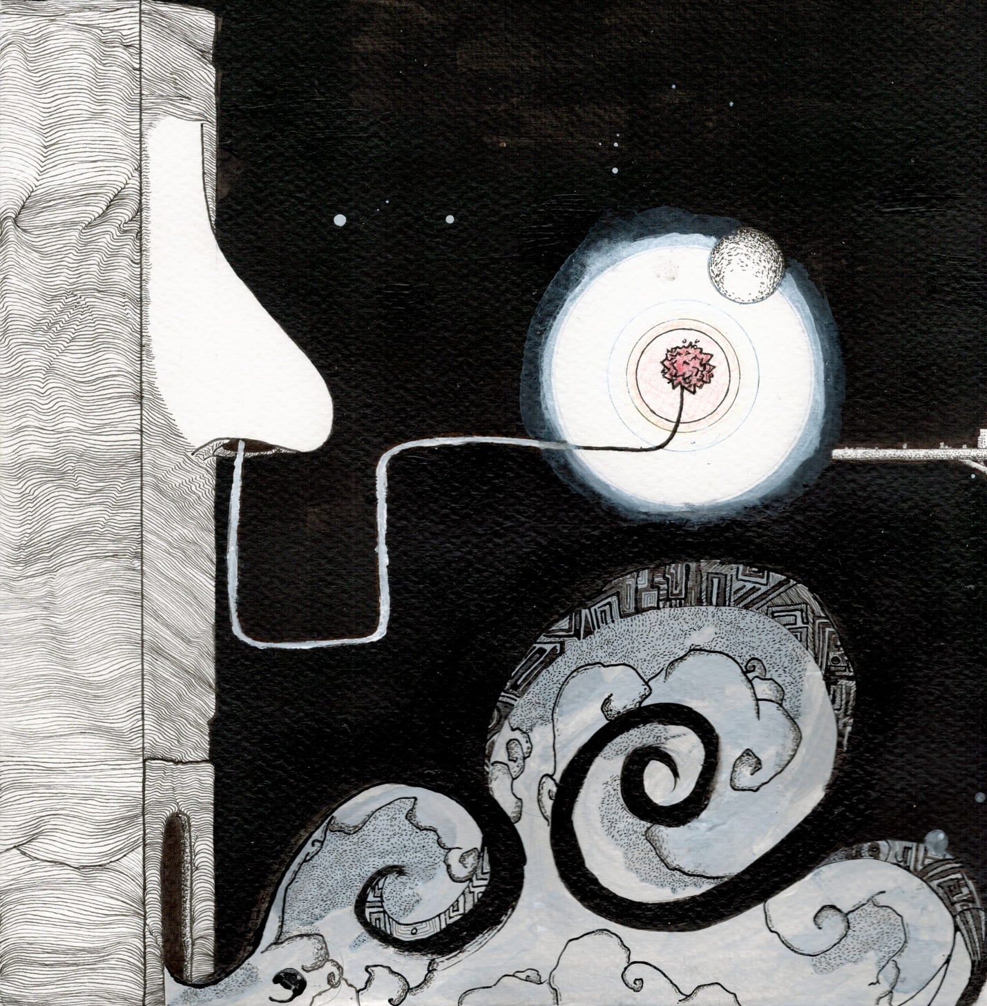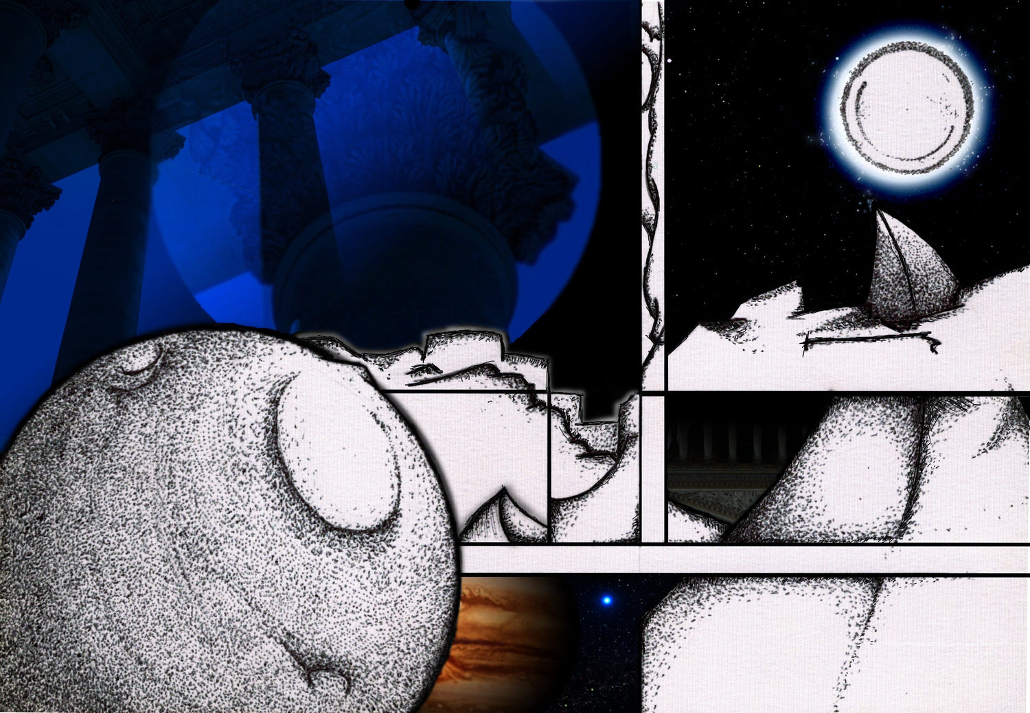 Certaines évoquent des vestiges, d’autres des passages. Un journal de bord imaginaire, composé d’artefacts visuels — aquarelles, pointillisme, montages numériques — comme autant de reliques d’univers parallèles.